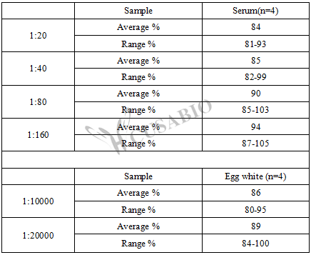 To assess the linearity of the assay, samples were spiked with high concentrations of chicken LZM in various matrices and diluted with the Sample Diluent to produce samples with values within the dynamic range of the assay.