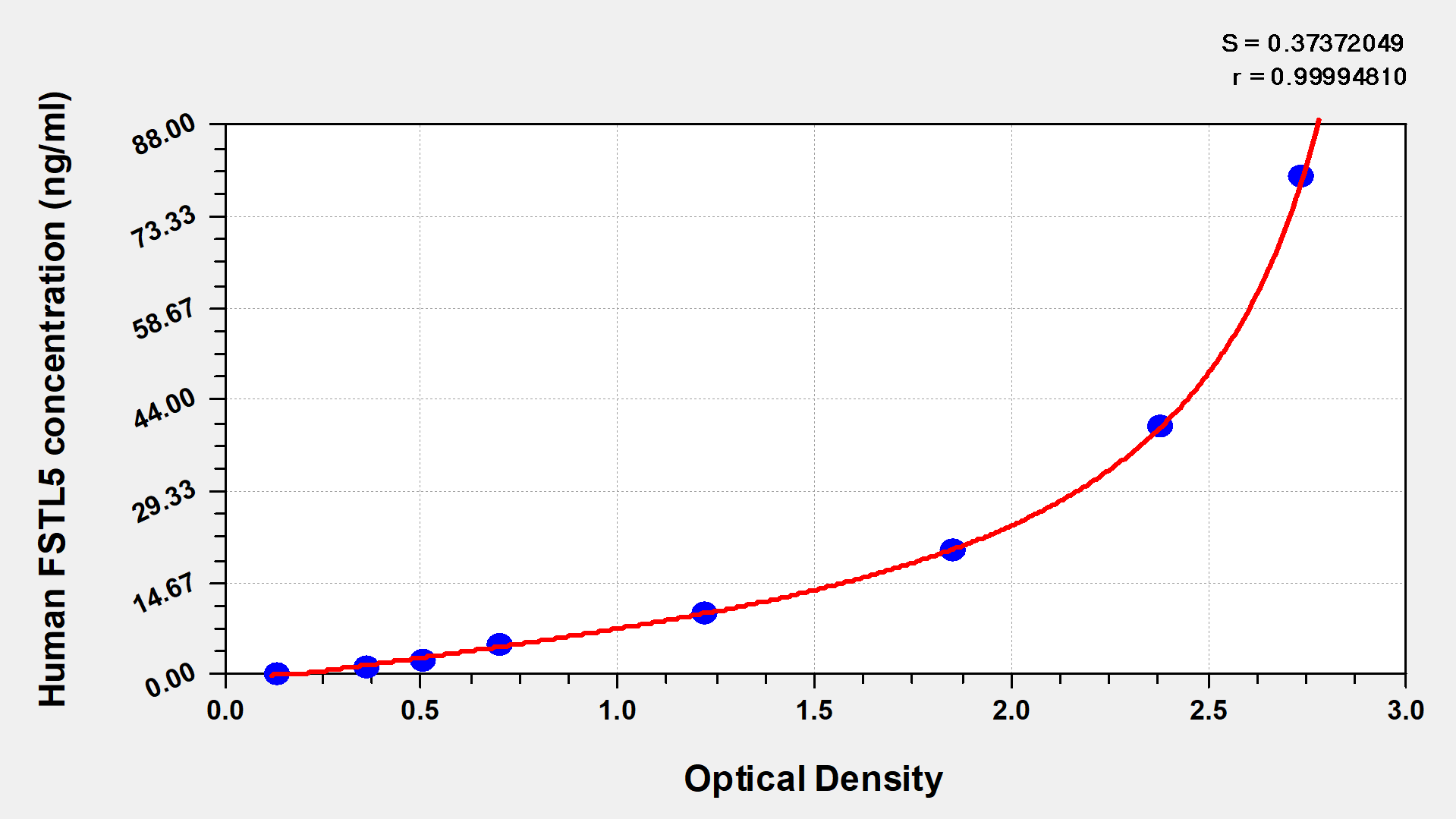 To assess the linearity of the assay, samples were spiked with high concentrations of human FSTL5 in various matrices and diluted with the Sample Diluent to produce samples with values within the dynamic range of the assay.