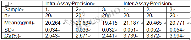 Three samples of known concentration were tested twenty times on one plate to assess.Inter-assay Precision (Precision between assays): CV%<10%Three samples of known concentration were tested in twenty assays to assess.
