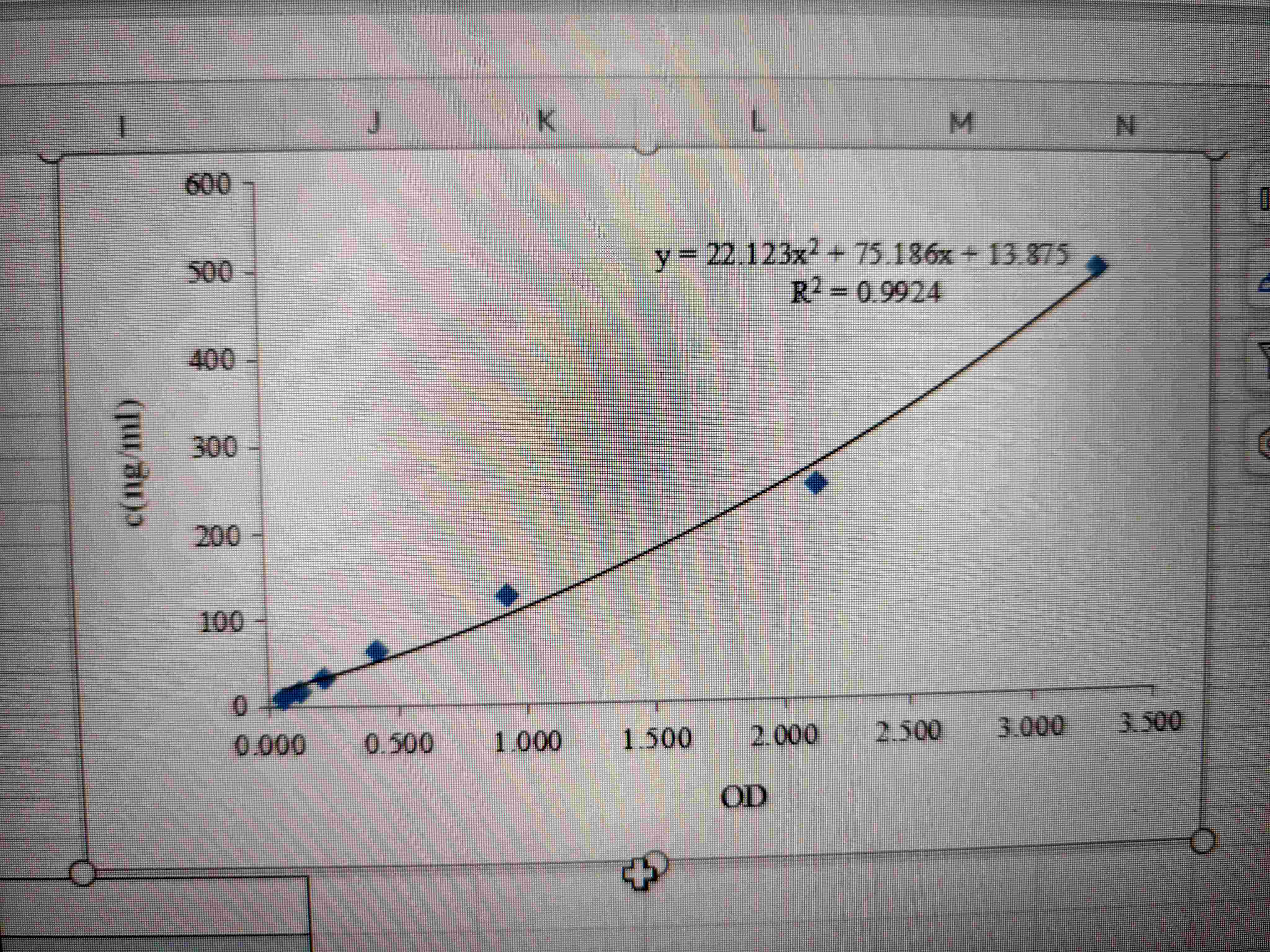 ng/ml OD1 OD2 Average Corrected 500 2.659 2.563 2.611 2.519 250 2.240 2.128 2.184 2.092 125 1.488 1.375 1.432 1.340 62.5 0.845 0.817 0.831 0.739 31.2 0.444 0.434 0.439 0.347 15.6 0.247 0.239 0.243 0.151 7.8 0.156 0.148 0.152 0.060 0 0.093 0.091 0.092 -