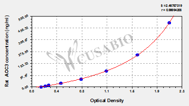 To assess the linearity of the assay, samples were spiked with high concentrations of rat AOC3 in various matrices and diluted with the Sample Diluent to produce samples with values within the dynamic range of the assay. Sample Serum(n=4) 1:1 Average % 85 Range % 84-94 1:2 Average % 96 Range % 91-102 1:4 Average % 84 Range % 81-88 1:8 Average % 93 Range % 88-99 -