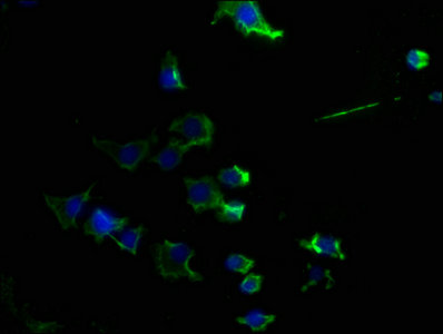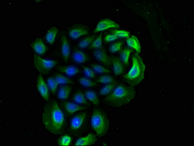 Immunofluorescence staining of HepG2 cells with CSB-MA004879A0m at 1:90, counter-stained with DAPI. The cells were blocked in 10% normal Goat Serum and then incubated with the primary antibody overnight at 4°C. The secondary antibody was Alexa Fluor 488-congugated AffiniPure Goat Anti-Mouse IgG(H+L).