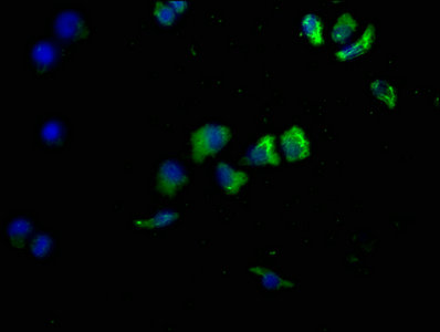 Immunofluorescence staining of Hela cells with CSB-MA004879A0m at 1:90, counter-stained with DAPI. The cells were blocked in 10% normal Goat Serum and then incubated with the primary antibody overnight at 4°C. The secondary antibody was Alexa Fluor 488-congugated AffiniPure Goat Anti-Mouse IgG(H+L).