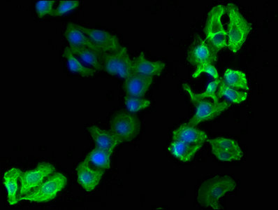 Immunofluorescence staining of A549 cells with CSB-MA004879A0m at 1:90, counter-stained with DAPI. The cells were blocked in 10% normal Goat Serum and then incubated with the primary antibody overnight at 4°C. The secondary antibody was Alexa Fluor 488-congugated AffiniPure Goat Anti-Mouse IgG(H+L).