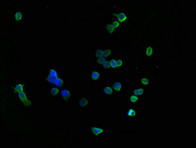 Immunofluorescence staining of RAW264.7 cells with CSB-MA004879A0m at 1:90, counter-stained with DAPI. The cells were blocked in 10% normal Goat Serum and then incubated with the primary antibody overnight at 4°C. The secondary antibody was Alexa Fluor 488-congugated AffiniPure Goat Anti-Mouse IgG(H+L).