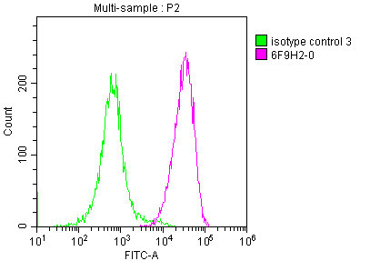 Overlay Peak curve showing JK cells stained with CSB-MA004941A0m (red line) at 1:200. The cells were incubated in 10% normal goat serum to block non-specific protein-protein interactions followed by the antibody (1μg/1*106cells) for 1h at 4°C. The secondary antibody used was FITC-conjugated Goat Anti-Mouse IgG(H+L) at 1/100 dilution for 30min at 4°C. Isotype control antibody (green line) was mouse IgG1 (1μg/1*106cells) used under the same conditions. Acquisition of >10,000 events was performed.