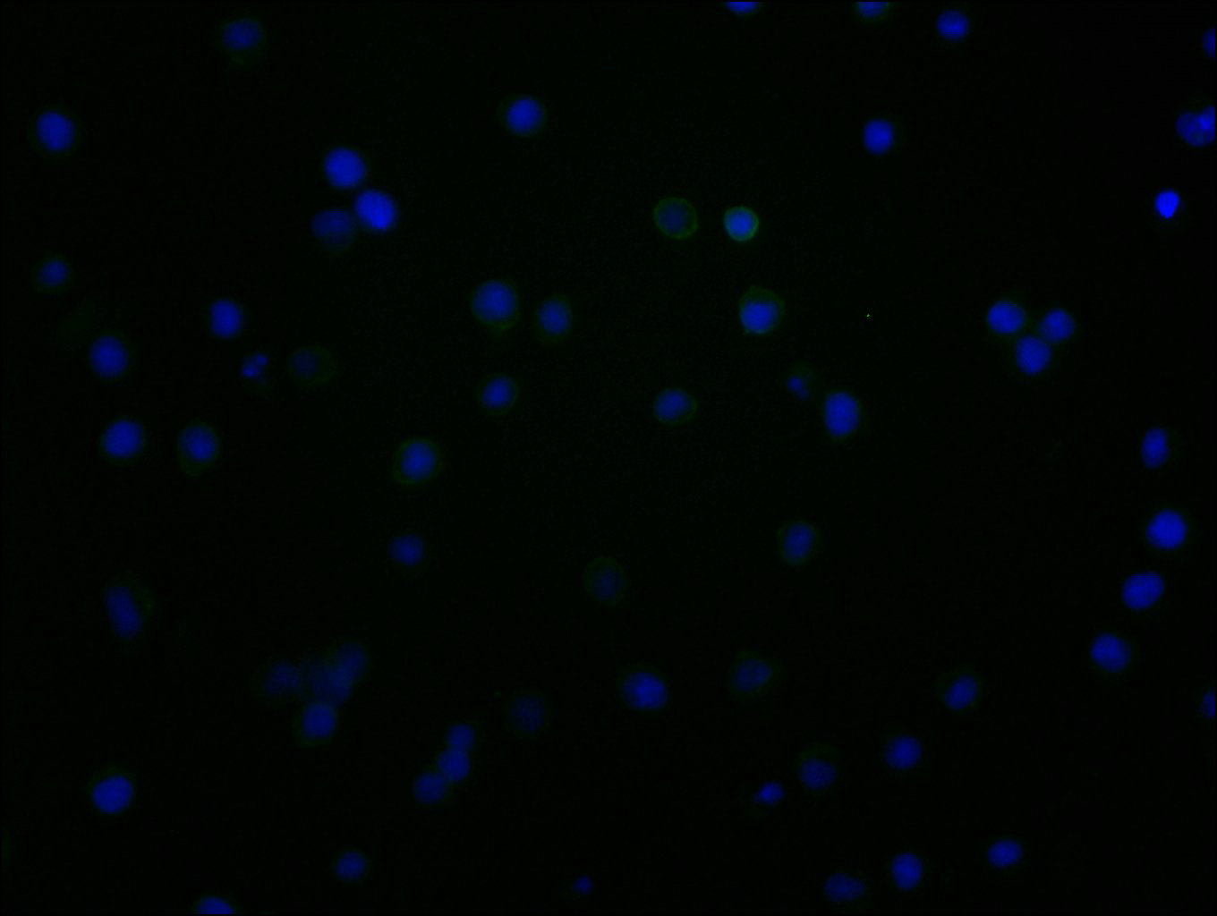 Immunofluorescence staining of JK cells with CSB-MA004941A0m at 1:100, counter-stained with DAPI. The cells were fixed in 4% formaldehyde and blocked in 10% normal Goat Serum. The cells were incubated with the antibody overnight at 4°C. Nuclear DNA was labeled in blue with DAPI. The secondary antibody was FITC-conjugated AffiniPure Goat Anti-Mouse IgG (H+L).