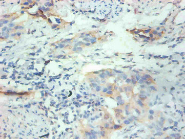 Immunohistochemical of paraffin-embedded human breast cancer tissue using CSB-MA077601A0m at dilution of 1:200