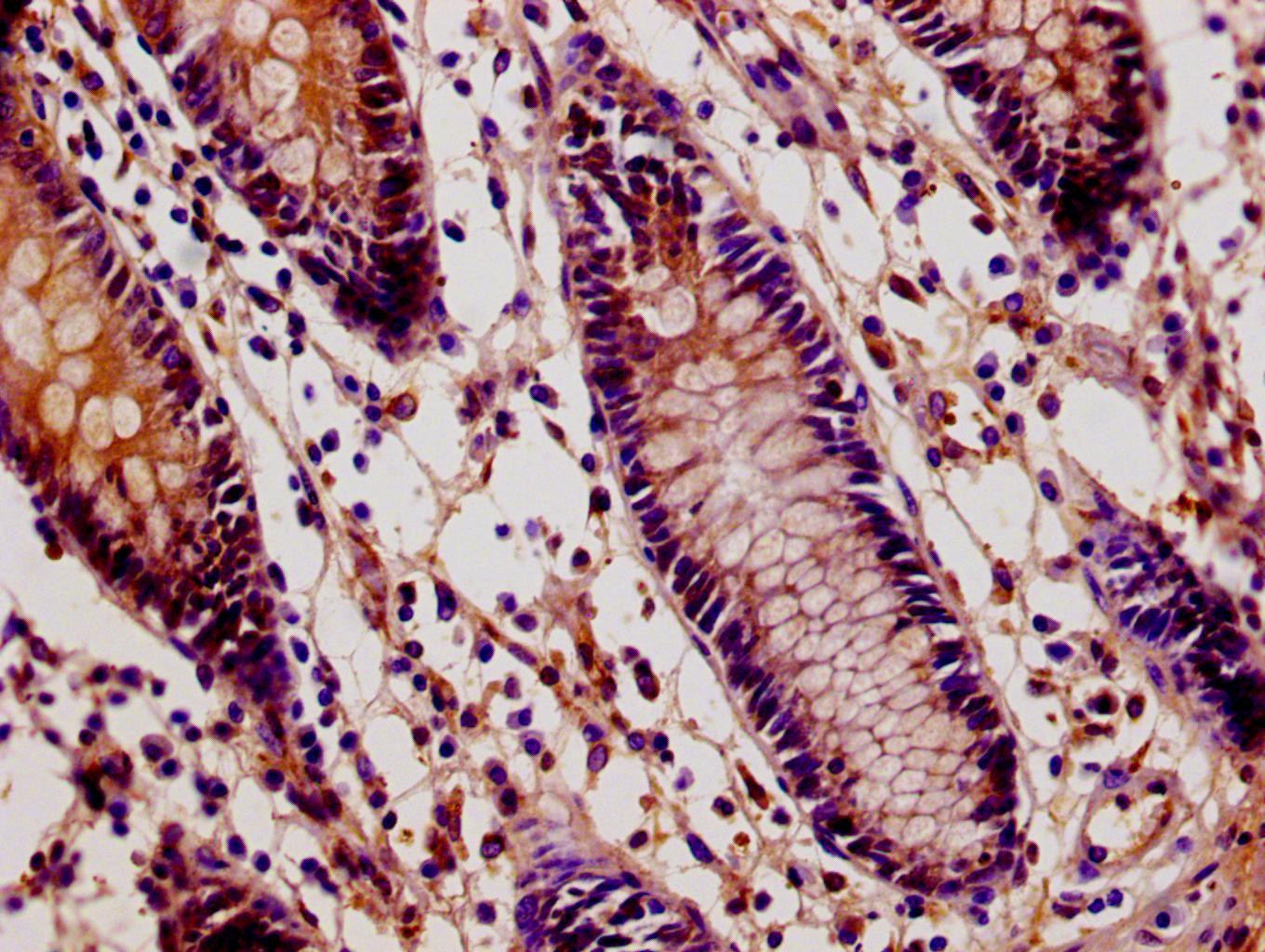 IHC image of CSB-MA009298A0m diluted at 1:100 and staining in paraffin-embedded human colon tissue performed on a Leica BondTM system. After dewaxing and hydration, antigen retrieval was mediated by high pressure in a citrate buffer (pH 6.0). Section was blocked with 10% normal goat serum 30min at RT. Then primary antibody (1% BSA) was incubated at 4°C overnight. The primary is detected by a biotinylated secondary antibody and visualized using an HRP conjugated SP system.
