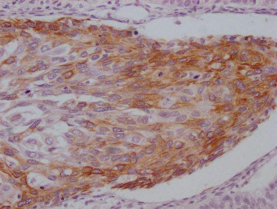 IHC image of CSB-MA785224 diluted at 1:100 and staining in paraffin-embedded human cervical cancer performed on a Leica BondTM system. After dewaxing and hydration, antigen retrieval was mediated by high pressure in a citrate buffer (pH 6.0). Section was blocked with 10% normal goat serum 30min at RT. Then primary antibody (1% BSA) was incubated at 4°C overnight. The primary is detected by a Goat anti-mouse IgG polymer labeled by HRP and visualized using 0.05% DAB.