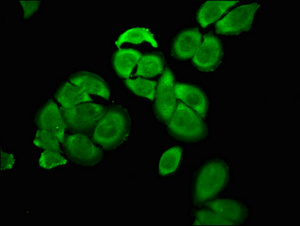 Immunofluorescence staining of A549 cells with CSB-MA018403A0m at 1:100, counter-stained with DAPI. The cells were blocked in 10% normal Goat Serum and then incubated with the primary antibody overnight at 4°C. The secondary antibody was Alexa Fluor 488-congugated AffiniPure Goat Anti-Mouse IgG(H+L).
