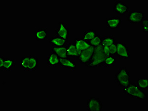 Immunofluorescence staining of Ntera-2 cells with CSB-MA018403A0m at 1:100, counter-stained with DAPI. The cells were blocked in 10% normal Goat Serum and then incubated with the primary antibody overnight at 4°C. The secondary antibody was Alexa Fluor 488-congugated AffiniPure Goat Anti-Mouse IgG(H+L).