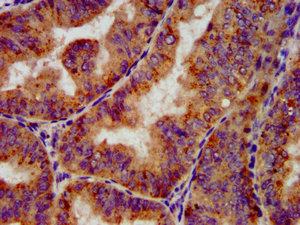 IHC image of CSB-MA018403A0m diluted at 1:100 and staining in paraffin-embedded human colon cancer performed on a Leica BondTM system. After dewaxing and hydration, antigen retrieval was mediated by high pressure in a citrate buffer (pH 6.0). Section was blocked with 10% normal goat serum 30min at RT. Then primary antibody (1% BSA) was incubated at 4°C overnight. The primary is detected by a biotinylated secondary antibody and visualized using an HRP conjugated SP system.