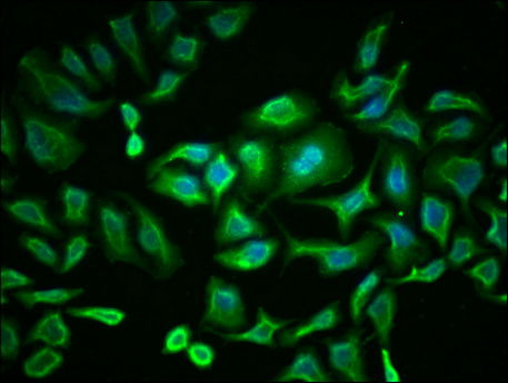 Immunofluorescence staining of HepG2 cells with CSB-MA018072A0m at 1:230, counter-stained with DAPI. The cells were blocked in 10% normal Goat Serum and then incubated with the primary antibody overnight at 4°C. The secondary antibody was Alexa Fluor 488-congugated AffiniPure Goat Anti-Mouse IgG(H+L).