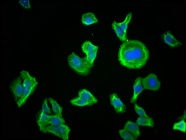 Immunofluorescence staining of A549 cells with CSB-MA018072A0m at 1:230, counter-stained with DAPI. The cells were blocked in 10% normal Goat Serum and then incubated with the primary antibody overnight at 4°C. The secondary antibody was Alexa Fluor 488-congugated AffiniPure Goat Anti-Mouse IgG(H+L).