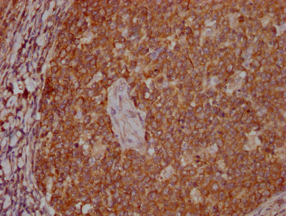 IHC image of CSB-MA018072A0m diluted at 1:400 and staining in paraffin-embedded human lung cancer tissue performed on a Leica BondTM system. After dewaxing and hydration, antigen retrieval was mediated by high pressure in a citrate buffer (pH 6.0). Section was blocked with 10% normal goat serum 30min at RT. Then primary antibody (1% BSA) was incubated at 4°C overnight. The primary is detected by a biotinylated secondary antibody and visualized using an HRP conjugated SP system.