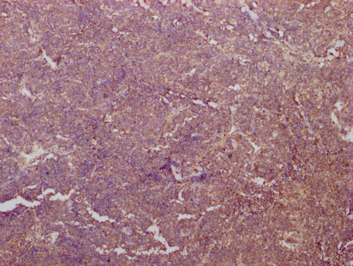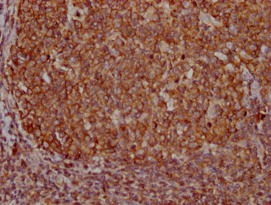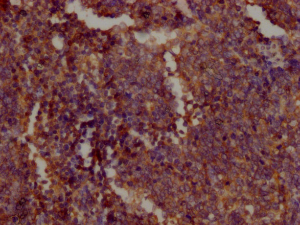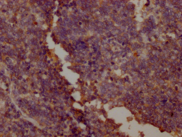 IHC image of CSB-MA018072A0m diluted at 1:400 and staining in paraffin-embedded human tonsil tissue performed on a Leica BondTM system. After dewaxing and hydration, antigen retrieval was mediated by high pressure in a citrate buffer (pH 6.0). Section was blocked with 10% normal goat serum 30min at RT. Then primary antibody (1% BSA) was incubated at 4°C overnight. The primary is detected by a biotinylated secondary antibody and visualized using an HRP conjugated SP system.