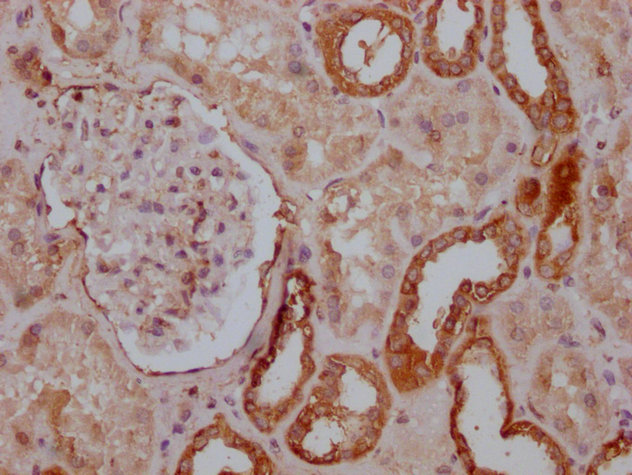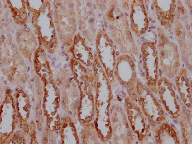IHC image of CSB-MA018072A0m diluted at 1:400 and staining in paraffin-embedded human kidney tissue performed on a Leica BondTM system. After dewaxing and hydration, antigen retrieval was mediated by high pressure in a citrate buffer (pH 6.0). Section was blocked with 10% normal goat serum 30min at RT. Then primary antibody (1% BSA) was incubated at 4°C overnight. The primary is detected by a biotinylated secondary antibody and visualized using an HRP conjugated SP system.