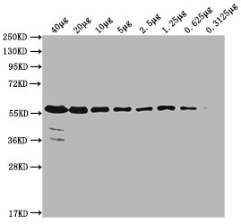 Positive WB detected in: MCF-7 whole cell lysate at 40µg, 20µg, 10µg, 5µg, 2.5µg, 1.25µg, 0.625µg, 0.3125µg