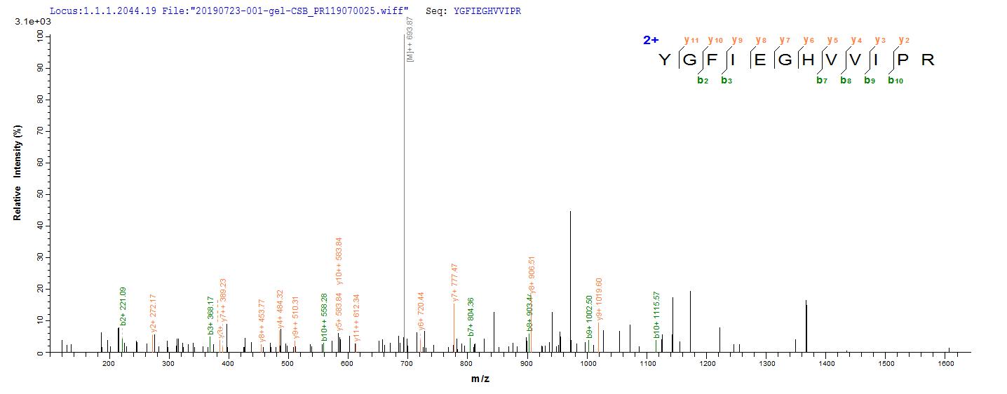 Based on the SEQUEST from database of Mammalian Cell host and target protein, the LC-MS/MS Analysis result of CSB-MP004938HU(F1) could indicate that this peptide derived from Mammalian Cell-expressed Homo sapiens (Human) CD44.