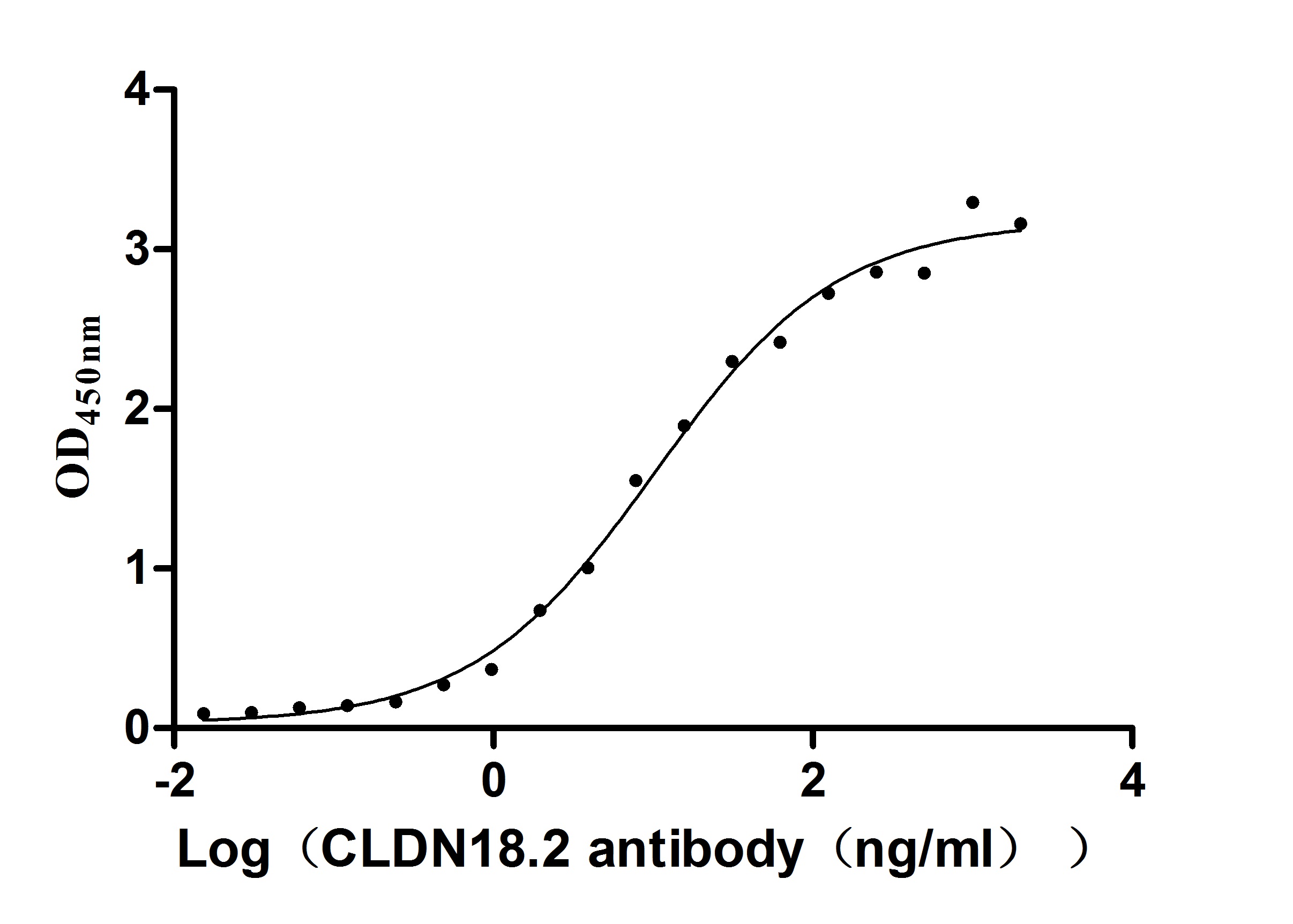 Measured by its binding ability in a functional ELISA. Immobilized human CLDN18.2 (CSB-MP005498HU(A5)) at 5 μg/ml can bind anti-CLDN18.2 recombinant Monoclonal Antibody (CSB-RA005498A1HU), the the EC50 is 5.225-9.256 ng/ml. Biological Activity Assay -