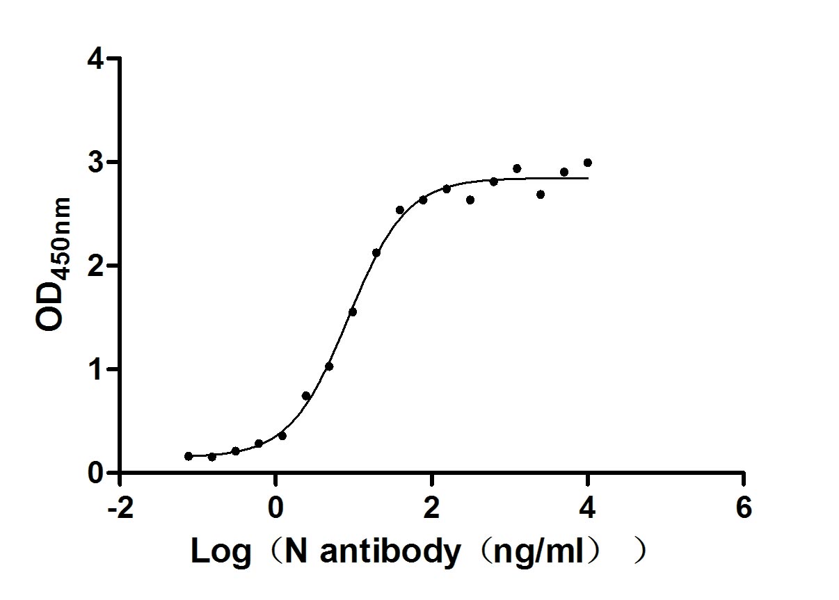 Measured by its binding ability in a functional ELISA. Immobilized N (CSB-EP3325GMY(M5)) at 2 μg/ml can bind N Recombinant Antibody(CSB-RA33255A1GMY), the EC50 of N Recombinant Antibody is 7.358-9.976 ng/ml. Biological Activity Assay