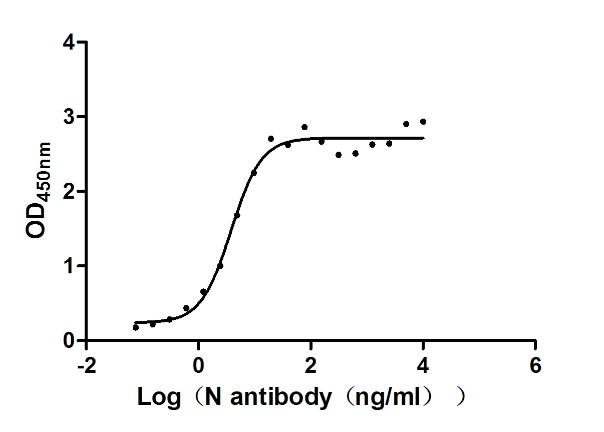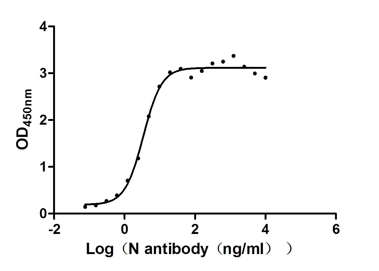 Measured by its binding ability in a functional ELISA. Immobilized N (CSB-EP3325GMY(M4)) at 2 μg/ml can bind N Mouse Monoclonal Antibody(CSB-MA33255A2m), the EC50 of N Mouse Monoclonal Antibody is 3.246-4.503 ng/ml. Biological Activity Assay -