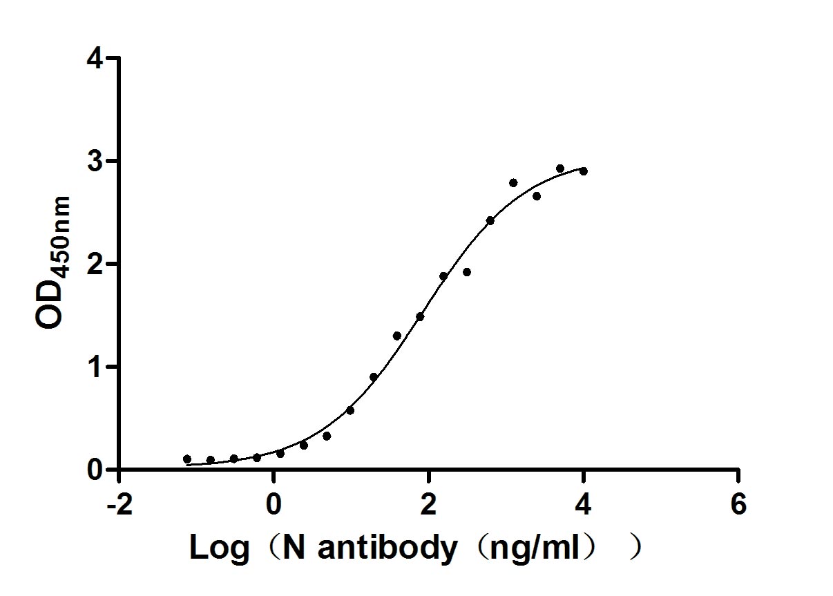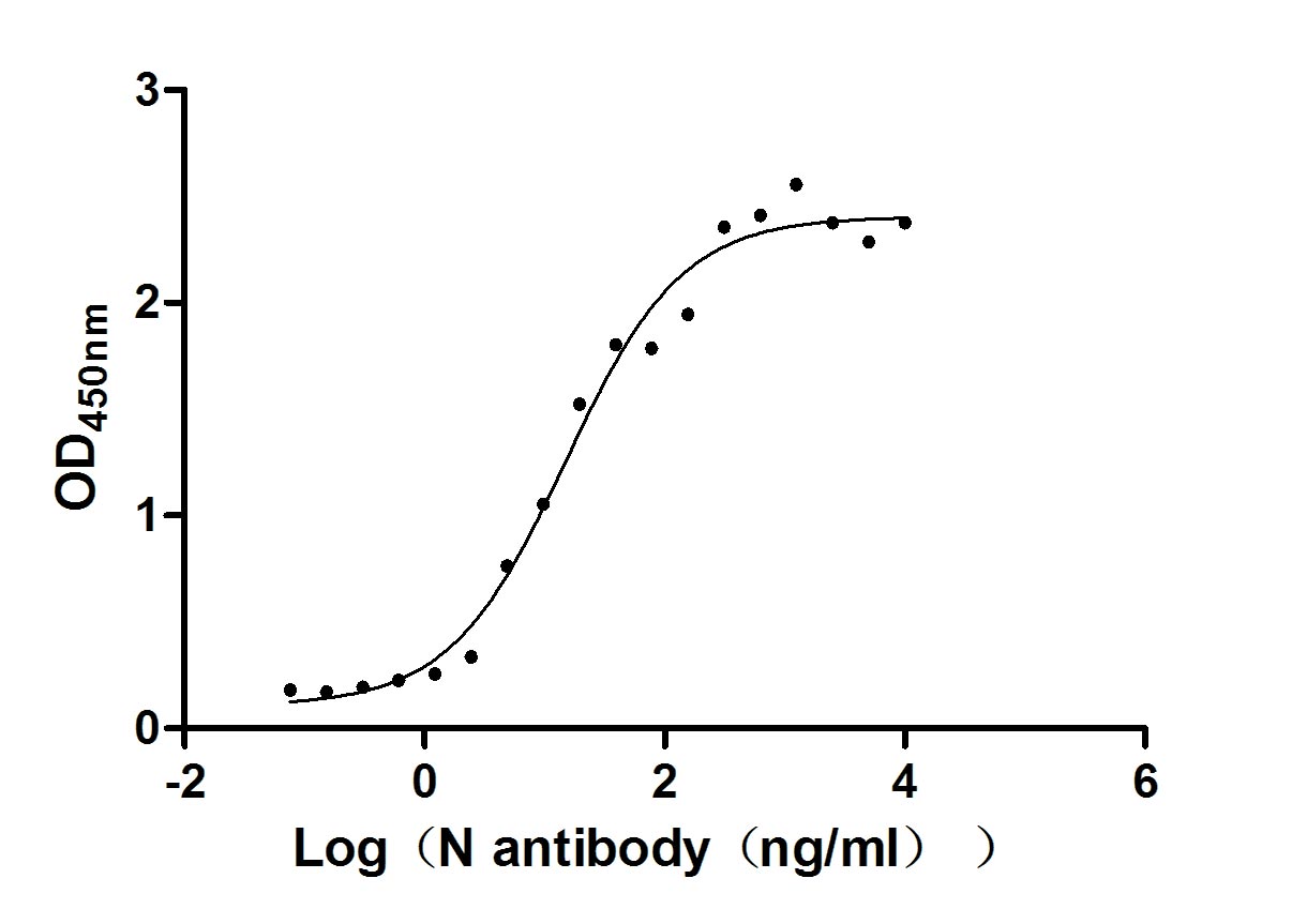 Measured by its binding ability in a functional ELISA. Immobilized N (CSB-EP3325GMY(M3)) at 2 μg/ml can bind N Mouse Monoclonal Antibody(CSB-MA33255A2m), the EC50 of N Mouse Monoclonal Antibody is 11.40-19.77 ng/ml. Biological Activity Assay -