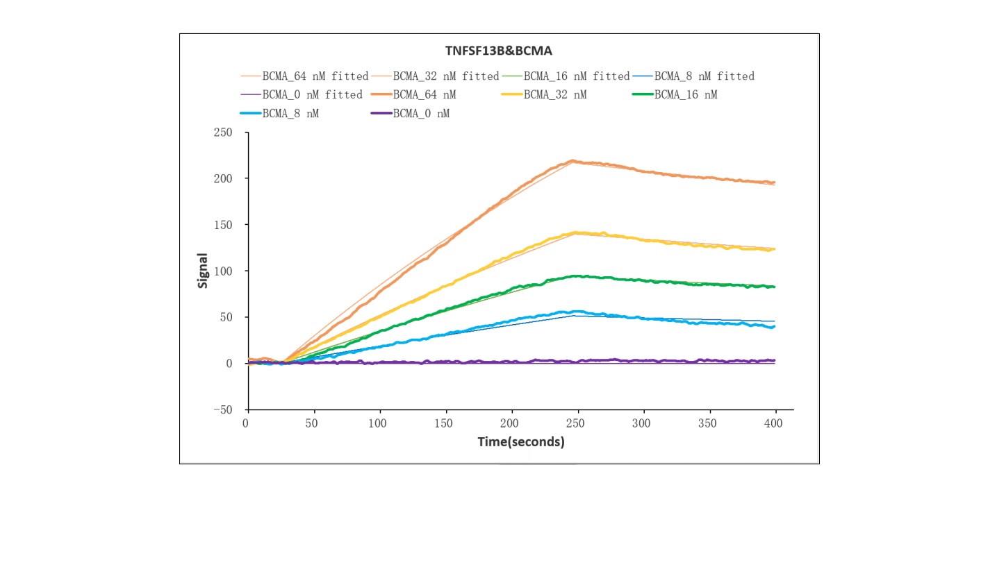 生物活性:①Measured by its binding ability in a functional ELISA. Immobilized TNFRSF14 (CSB-MP842173HU) at 5 μg/ml can bind TNFSF14, the EC50 is 45.44-53.29 ng/ml.