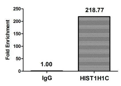 Chromatin Immunoprecipitation Hela (4*106, treated with 30mM sodium butyrate for 4h) were treated with Micrococcal Nuclease, sonicated, and immunoprecipitated with 5µg anti-HIST1H1C (CSB-PA010378OA109hibHU) or a control normal rabbit IgG. The resulting ChIP DNA was quantified using real-time PCR with primers against the β-Globin promoter.