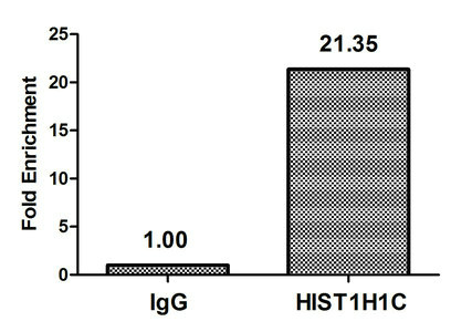 Chromatin Immunoprecipitation Hela (106, treated with 30mM sodium butyrate for 4h) were treated with Micrococcal Nuclease, sonicated, and immunoprecipitated with 5µg anti-HIST1H1C (CSB-PA010378OA158hibHU) or a control normal rabbit IgG. The resulting ChIP DNA was quantified using real-time PCR with primers against the β-Globin promoter.