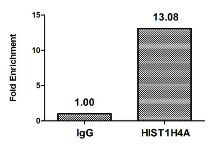 Chromatin Immunoprecipitation Hela (4*106, treated with 30mM sodium butyrate for 4h) were treated with Micrococcal Nuclease, sonicated, and immunoprecipitated with 5μg anti-HIST1H4A (CSB-PA010429PA12hibHU) or a control normal rabbit IgG. The resulting ChIP DNA was quantified using real-time PCR with primers against the β-Globin promoter.