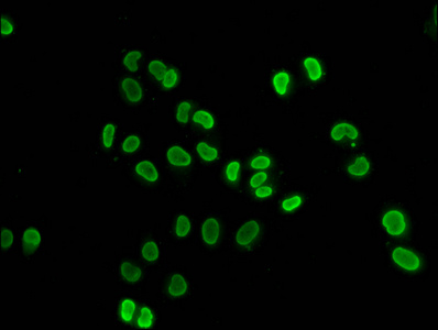 Immunofluorescence staining of Hela cells (treated with 30mM sodium butyrate for 4h) with CSB-PA010429OA91hibHU at 1:50, counter-stained with DAPI. The cells were fixed in 4% formaldehyde, permeabilized using 0.2% Triton X-100 and blocked in 10% normal Goat Serum. The cells were then incubated with the antibody overnight at 4°C. The secondary antibody was Alexa Fluor 488-congugated AffiniPure Goat Anti-Rabbit IgG(H+L).