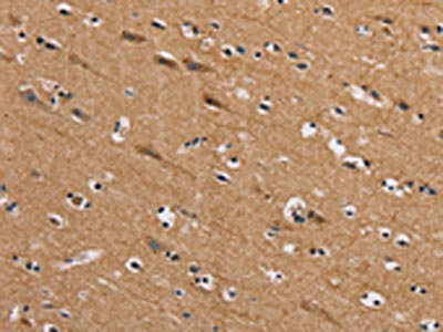 The image on the left is immunohistochemistry of paraffin-embedded Human brain tissue using CSB-PA211579(AAAS Antibody) at dilution 1/20, on the right is treated with fusion protein. (Original magnification: ×200)