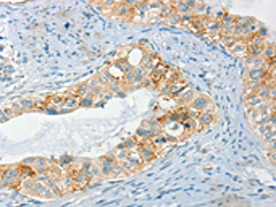 The image on the left is immunohistochemistry of paraffin-embedded Human thyroid cancer tissue using CSB-PA231814(AANAT Antibody) at dilution 1/40, on the right is treated with fusion protein. (Original magnification: ×200)