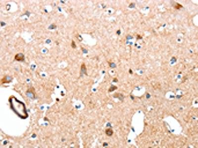 The image on the left is immunohistochemistry of paraffin-embedded Human brain tissue using CSB-PA066208(AARS Antibody) at dilution 1/50, on the right is treated with synthetic peptide. (Original magnification: ×200)