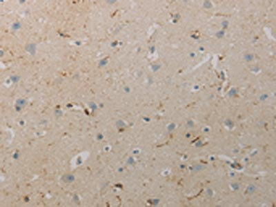 The image on the left is immunohistochemistry of paraffin-embedded Human brain tissue using CSB-PA698191(AATK Antibody) at dilution 1/10, on the right is treated with synthetic peptide. (Original magnification: ×200)
