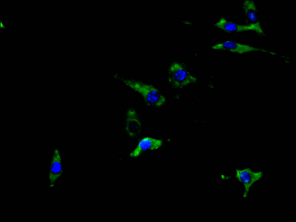 Immunofluorescence staining of SH-SY5Y cell with CSB-PA827811 at 1:30, counter-stained with DAPI. The cells were fixed in 4% formaldehyde and blocked in 10% normal Goat Serum. The cells were then incubated with the antibody overnight at 4C. The secondary antibody was Alexa Fluor 488-congugated AffiniPure Goat Anti-Rabbit IgG(H+L).