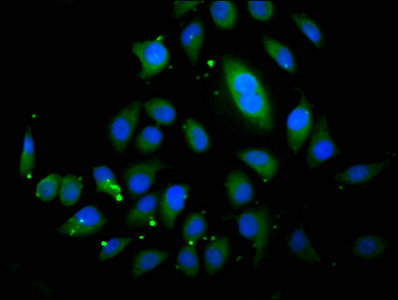 Immunofluorescence staining of A549 cells with CSB-PA001050LA01HU at 1:200, counter-stained with DAPI. The cells were fixed in 4% formaldehyde, permeabilized using 0.2% Triton X-100 and blocked in 10% normal Goat Serum. The cells were then incubated with the antibody overnight at 4°C. The secondary antibody was Alexa Fluor 488-congugated AffiniPure Goat Anti-Rabbit IgG(H+L).