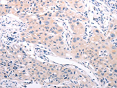 The image on the left is immunohistochemistry of paraffin-embedded Human lung cancer tissue using CSB-PA595084(ABCF3 Antibody) at dilution 1/30, on the right is treated with fusion protein. (Original magnification: ×200)