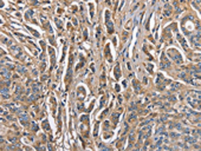 The image on the left is immunohistochemistry of paraffin-embedded Human liver cancer tissue using CSB-PA223414(ABI3BP Antibody) at dilution 1/60, on the right is treated with fusion protein. (Original magnification: ×200)