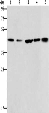 Gel: 10%SDS-PAGE, Lysate: 40 μg, Lane 1-5: Hela cells, A549 cells, NIH/3T3 cells, A172 cells, human liver cancer tissue, Primary antibody: CSB-PA614749(ACAA2 Antibody) at dilution 1/225, Secondary antibody: Goat anti rabbit IgG at 1/8000 dilution, Exposure time: 20 seconds