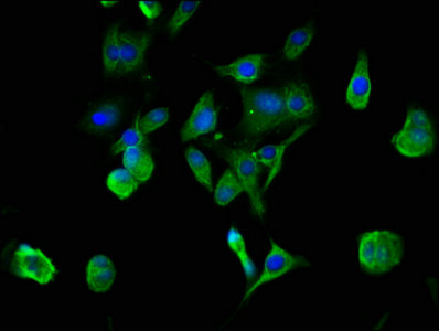 Immunofluorescence staining of MCF-7 cells with CSB-PA5619A0Rb at 1:100, counter-stained with DAPI. The cells were fixed in 4% formaldehyde, permeabilized using 0.2% Triton X-100 and blocked in 10% normal Goat Serum. The cells were then incubated with the antibody overnight at 4°C. The secondary antibody was Alexa Fluor 488-congugated AffiniPure Goat Anti-Rabbit IgG(H+L).