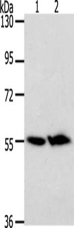 Gel: 8%SDS-PAGE, Lysate: 40 μg, Lane 1-2: Mouse kidney tissue, Mouse liver tissue, Primary antibody: CSB-PA787914(ACOT2 Antibody) at dilution 1/200, Secondary antibody: Goat anti rabbit IgG at 1/8000 dilution, Exposure time: 5 minutes