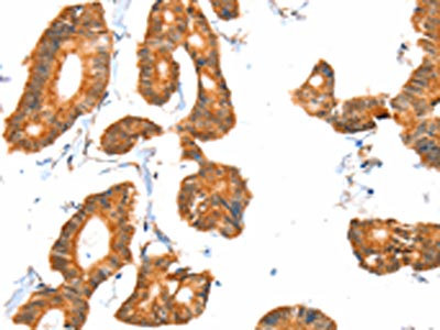 The image on the left is immunohistochemistry of paraffin-embedded Human colon cancer tissue using CSB-PA776608(ACOX1 Antibody) at dilution 1/40, on the right is treated with fusion protein. (Original magnification: ×200)