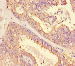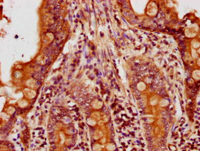 IHC image of CSB-PA01629A0Rb diluted at 1:500 and staining in paraffin-embedded human small intestine tissue performed on a Leica BondTM system. After dewaxing and hydration, antigen retrieval was mediated by high pressure in a citrate buffer (pH 6.0). Section was blocked with 10% normal goat serum 30min at RT. Then primary antibody (1% BSA) was incubated at 4°C overnight. The primary is detected by a biotinylated secondary antibody and visualized using an HRP conjugated SP system.
