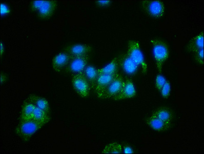 Immunofluorescence staining of HepG2 cells with CSB-PA01629A0Rb at 1:166, counter-stained with DAPI. The cells were fixed in 4% formaldehyde, permeabilized using 0.2% Triton X-100 and blocked in 10% normal Goat Serum. The cells were then incubated with the antibody overnight at 4°C. The secondary antibody was Alexa Fluor 488-congugated AffiniPure Goat Anti-Rabbit IgG(H+L).