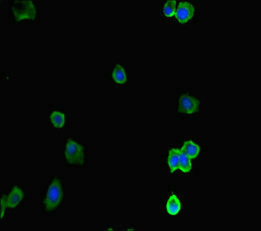 Immunofluorescent analysis of HepG2 cells using CSB-PA884496LA01HU at dilution of 1:100 and Alexa Fluor 488-congugated AffiniPure Goat Anti-Rabbit IgG(H+L)