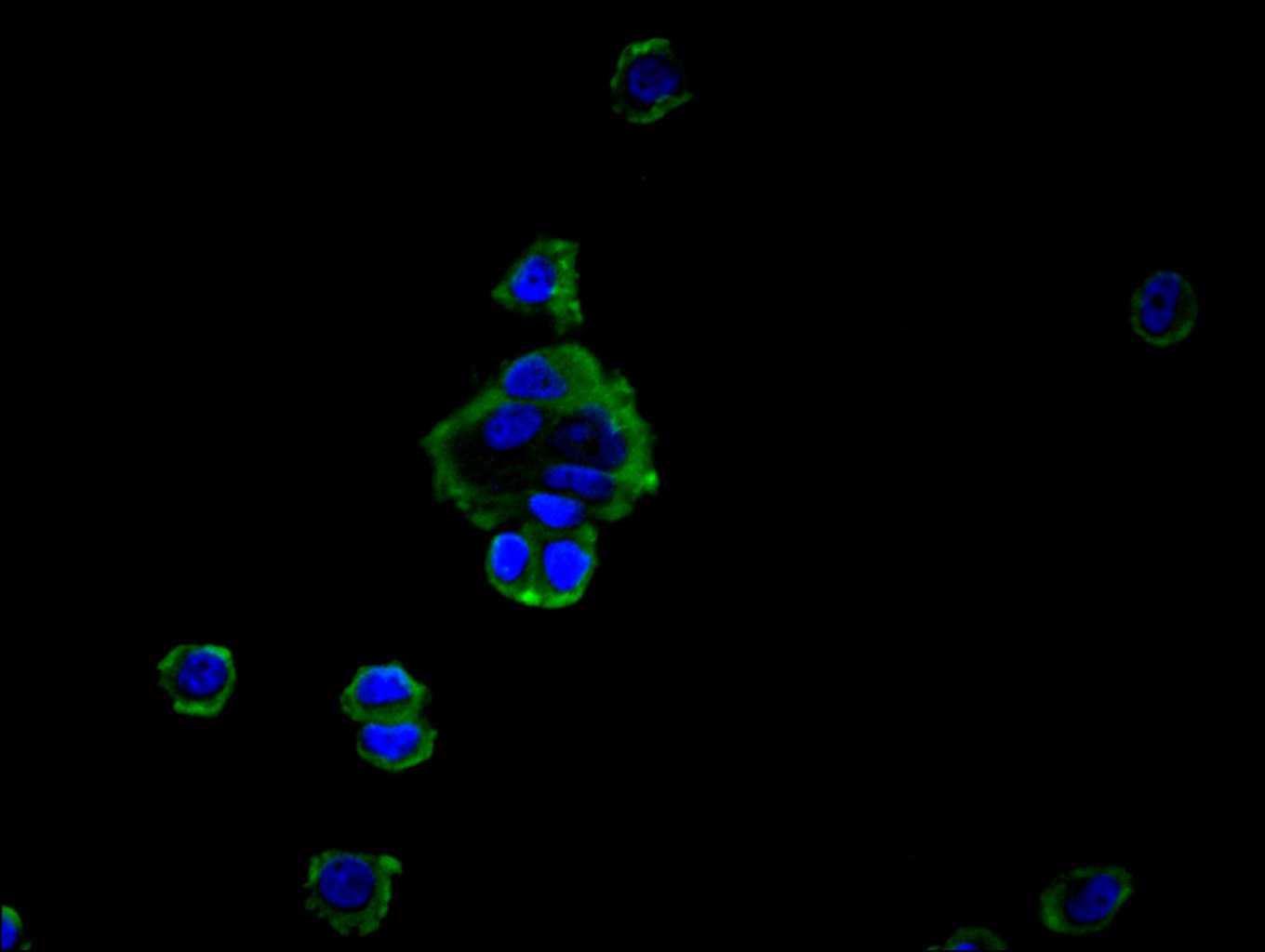 Immunofluorescence staining of MCF-7 cell with CSB-PA10259A0Rb at 1:30, counter-stained with DAPI. The cells were fixed in 4% formaldehyde and blocked in 10% normal Goat Serum. The cells were then incubated with the antibody overnight at 4C. The secondary antibody was Alexa Fluor 488-congugated AffiniPure Goat Anti-Rabbit IgG(H+L).