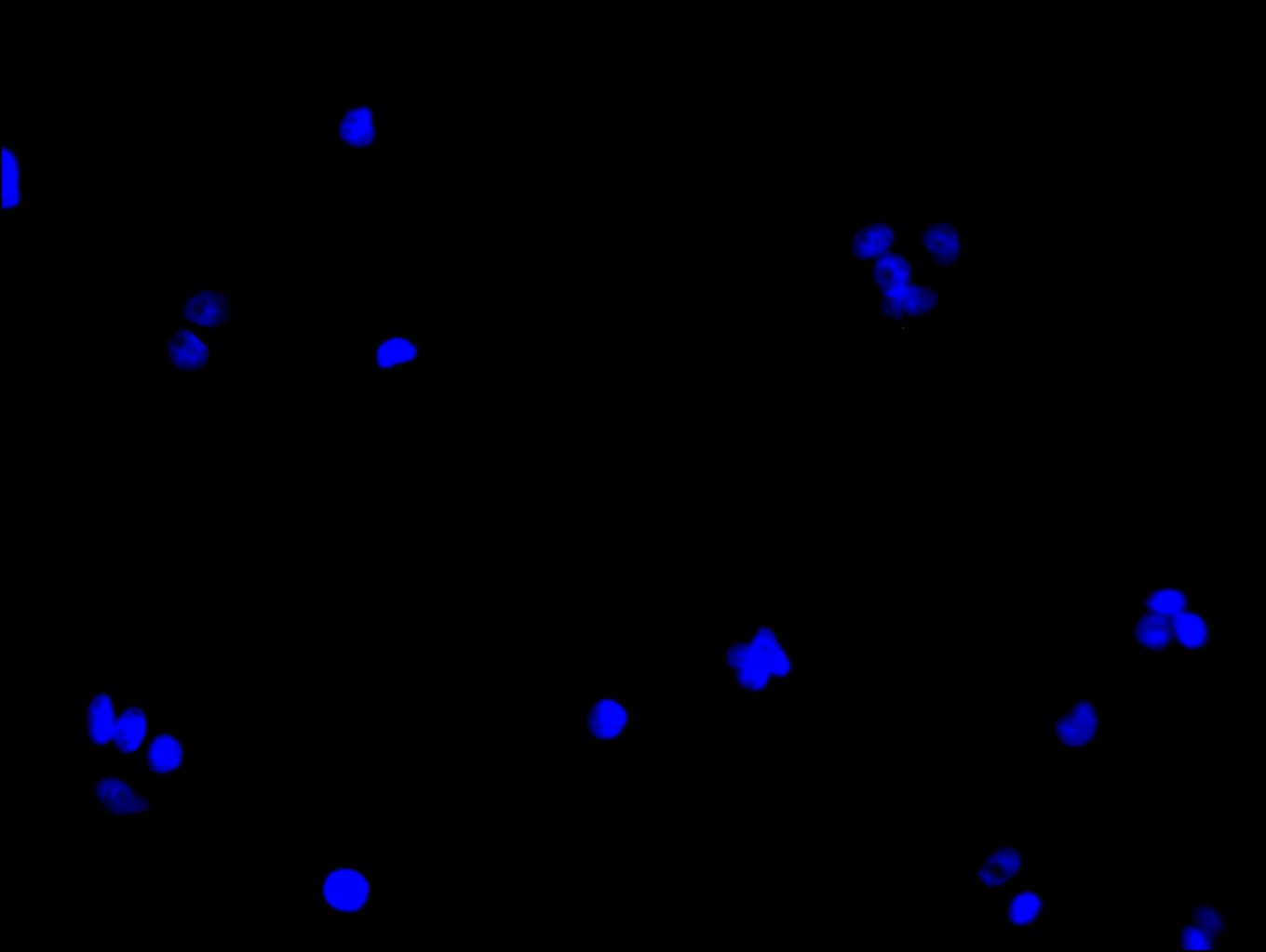 Immunofluorescence staining of Hela cell with 5% goat serum, counter-stained with DAPI. The cells were fixed in 4% formaldehyde and blocked in 10% normal Goat Serum. The cells were then incubated with the antibody overnight at 4C. The secondary antibody was Alexa Fluor 488-congugated AffiniPure Goat Anti-Rabbit IgG(H+L).